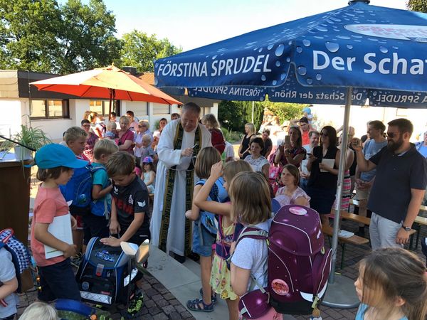 der Segnung der Kinder mit ihren Kindergartentaschen und